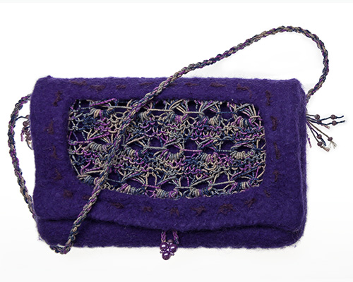 Auffallend durch den Strukturbruch zwischen robustem Filz und filigraner Lochstrickerei in der Taschenklappe.